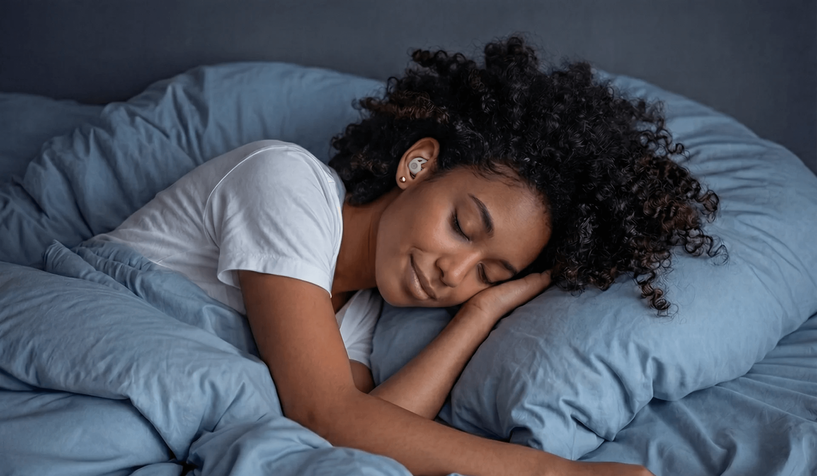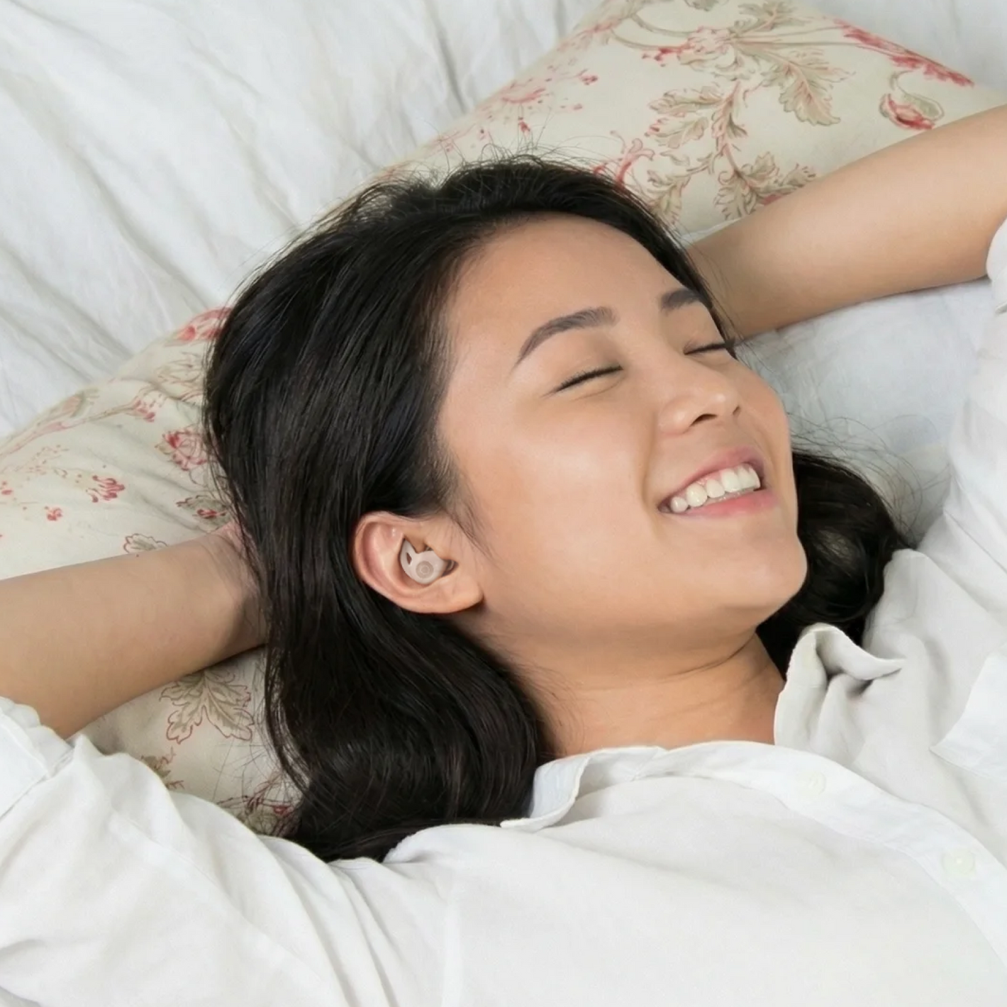 They sit flat in your ear, so your pillow won’t press on them—and at just 0.1 oz, they feel almost weightless.